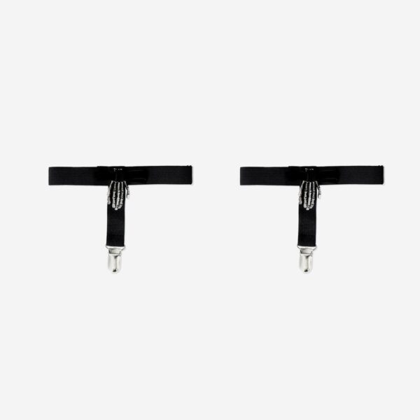 Add a playful twist to your Halloween wardrobe with these adjustable suspenders featuring skeleton hands. Designed in black with eye-catching skeletal details, they clip onto your thigh and add a striking visual element to any costume or outfit. Each set includes two pieces and is made from elastic textile with metal components for a secure and comfortable fit. Measuring 22 x 12 x 2 cm, they are adjustable to suit different sizes and styling preferences. Whether paired with stockings or layered under skirts for a bold surprise, these suspenders offer a fun way to embrace the season’s gothic spirit with flair and creativity.