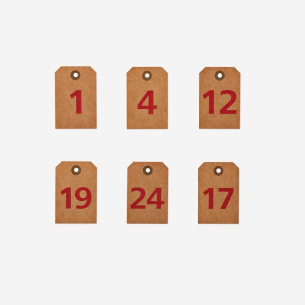 Festive paper gift tags with numbers from 1 to 24 perfect for an advent calendar. Measures 6 x 4 cm.