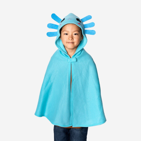 Let your child dive into imaginative play with this adorable axolotl cape costume. Measuring 85.5 x 77 cm, this soft polyester cape transforms kids into a cute axolotl, making it perfect for roleplay, themed parties, or carnival events. The cape features a hood with an axolotl face and colourful gills, adding a playful and magical touch to any dress up activity.