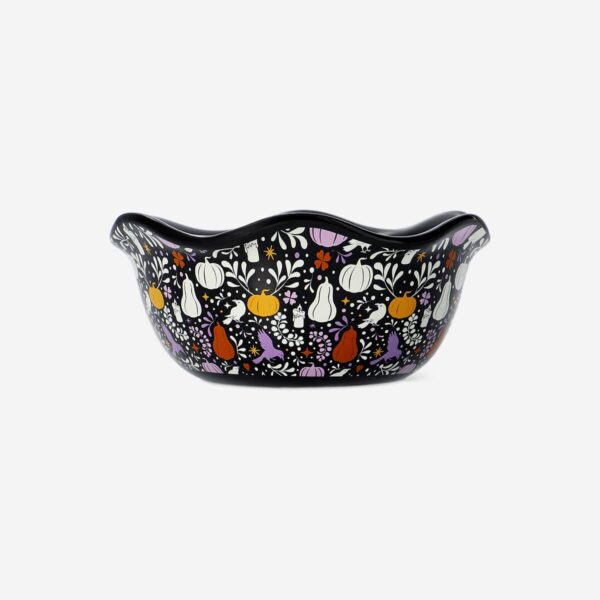 Celebrate Halloween in style with this black bowl with pumpkins, designed to add festive flair to your seasonal tableware. Made from ceramic and suitable for serving food, this bowl features a vibrant multicoloured pumpkin print that captures the spirit of trick-or-treating. The playful wavy edge adds a whimsical touch while offering a practical shape for serving snacks, sweets or dips during gatherings. Measuring 16.1 x 7 x 15.9 cm, it fits effortlessly into any kitchen or dining setting. Whether used as a centrepiece or a serving dish, this bowl brings charm and character to your autumn festivities. It is the perfect accessory for making your Halloween celebrations even more delightful.