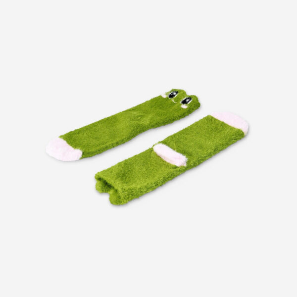 Brighten up your lounge time with these comfy frog socks in size 37/38. Designed in cheerful green with a pop of pink at the toes, they feature cute frog eyes at the top for a playful touch. Measuring 8.5 cm, they offer a snug fit and a soft feel that is ideal for relaxing at home. Made of textile, these fluffy socks are lightweight and perfect for adding a bit of fun to your everyday comfort. Whether curled up with a book or padding around the house, these socks are a cosy and quirky way to keep your feet warm with a smile.