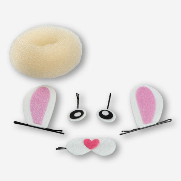 Elevate your Easter style with our DIY Easter hair kit. This delightful set of 6 pieces, in vibrant multi-colours, includes a hair doughnut and five hairpins featuring adorable eyes, ears, and a nose to create a charming rabbit-inspired look. Perfect for dressing up for Easter, our hair kit DIY set is sure to add a playful touch to your festive appearance. Dress up and celebrate Easter with creativity today.
