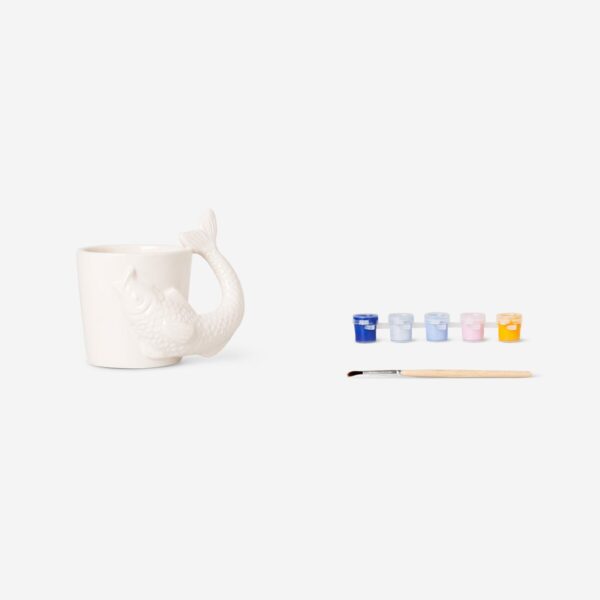 Create your own unique fish-themed mug with this fun DIY mug kit. Made from ceramics, this 12 x 8 x 8 cm mug features a sculpted fish handle, adding a playful touch to your drinkware. The set includes paints and a brush, allowing you to personalise your design before curing it in the oven at a maximum of 150°C for a lasting finish. With a 250 ml capacity, it is perfect for coffee, tea, or any favourite beverage. Suitable for food use, this DIY fish mug makes a creative and practical gift or a fun craft project to enjoy at home.