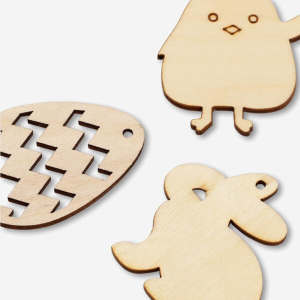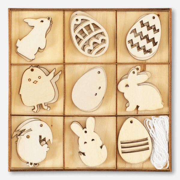 Get creative with these delightful DIY hanging decorations. This set includes 27 unpainted wooden pieces, perfect for crafting your own personalised decorations. Featuring a variety of charming shapes such as bunnies, eggs, and chicks, this set provides endless possibilities for your creative projects.