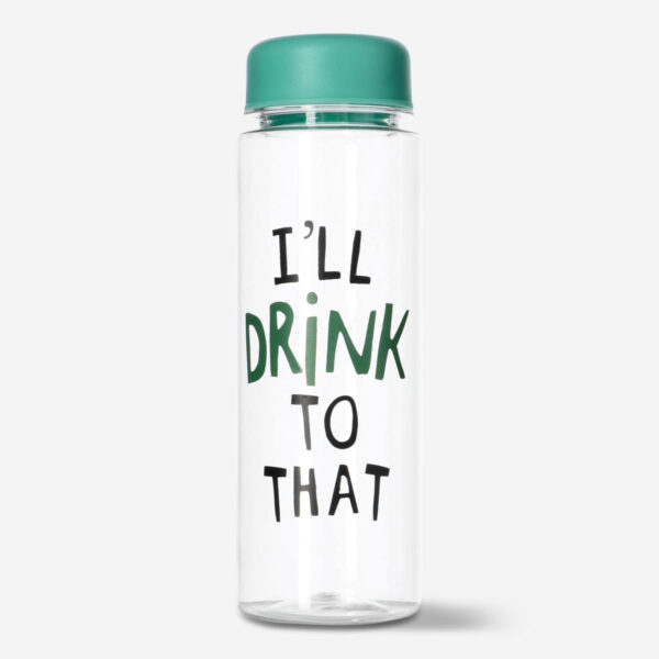 Transparent drinking bottle with text. Plastic. Holds 500 ml. Available in more designs.