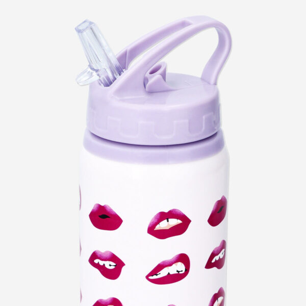Stay hydrated in style with this pink drinking bottle featuring a fun lips design. With a capacity of 560 ml, this beverage holder is perfect for both hot and cold drinks. Made from stainless steel, the bottle is both sleek and suitable for food. The single-wall construction and silicone lid ensure a tight seal, while the included straw and nozzle add convenience. Measuring 7 x 20 cm, this bottle is easy to carry and fits in most cup holders. Dishwasher safe and designed for use with liquids up to 40°C, it is a practical and stylish choice for daily hydration needs.