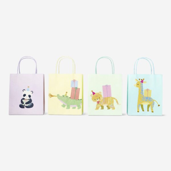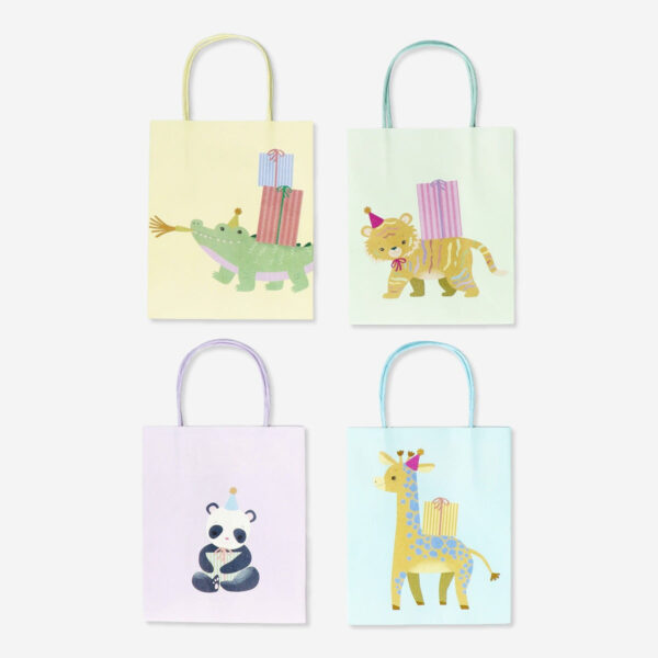 Elevate your gift presentations with our set of 4 animal print gift bags. Measuring 15 x 18 cm each, these paper gift bags come in soft pastel colours, featuring delightful animals on the front, such as a giraffe, crocodile, bear, or panda. The charming designs add a whimsical touch, making them the perfect addition to your birthday party preparations. Present your gifts in style and add a vibrant and playful flair to your celebrations.
