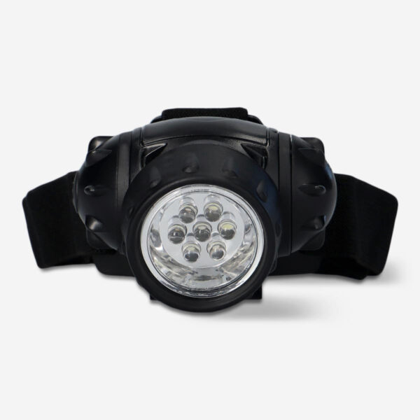 Head lamp with 7 LED lights. Adjustable strap and angle. Uses 3 x AAA batteries.