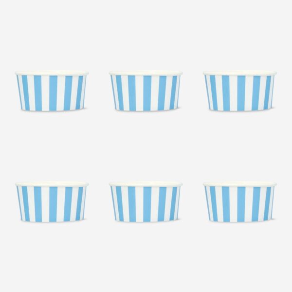 Looking for some cool ice cream cups? These paper cups are perfect for a summer day! The set includes 6 cups decorated with stylish blue and white stripes as well as 6 wooden spoons. Each cup measures 5 x 9.5 x 9.5 cm, making it just the right size for a tasty treat.