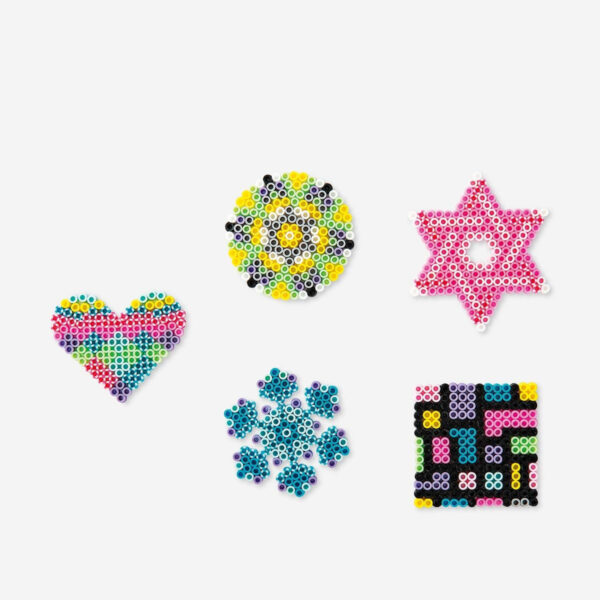 Set of beads in 12 colours (2,400 in total), pegboards in 5 shapes and ironing paper.