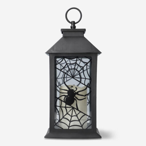 Decorate your home for Halloween with the festive lantern decorated with spooky spiders and spiderwebs. The lantern comes with a LED candle. Uses 3 x AAA batteries (not included).The lantern measures 27 x 14 x 14 cm.