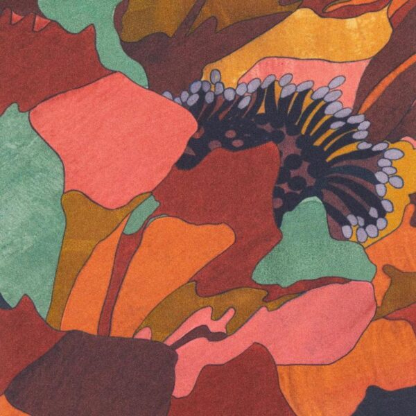 Exploring the flower as a vehicle for abstraction, this striking block coloured design was originally printed as a Liberty scarf in 1968. Dramatically cropped and zoomed-in, monumental peony petals create symphonies of contour and texture by revealing a fluid camouflage pattern. This print is part of the Floral Focus narrative of the collection – inspired by countless artists who have attempted to tame their unruly blooms through the genre of still life, this series is a true celebration of organic forms and flourishes.