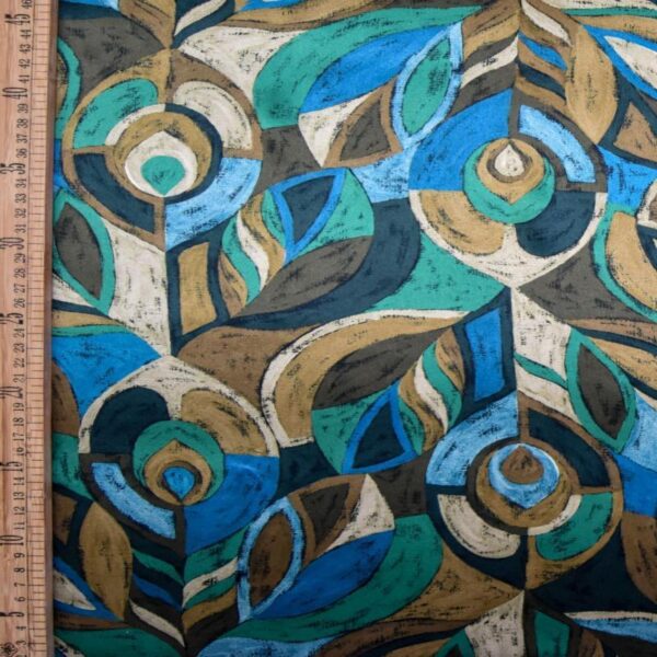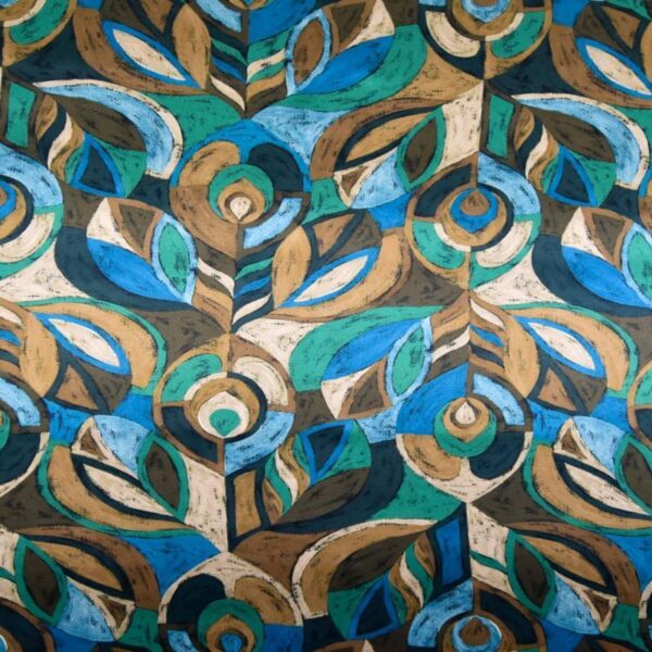Pastel Peacock was inspired by a pendant design discovered in a book of Liberty jewellery illustrations originating from the turn of the 20th century. Featuring a simplified rendition of a peacock feather motif, the pencil-drawn sketch was reimagined with richly textured, acrylic paint. Flowing both vertically and horizontally across the fabric, this graphic pattern is imbued with a sense of alternating movement.
