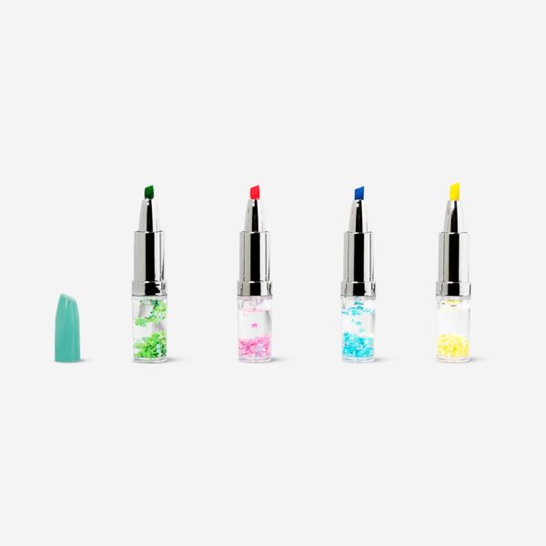 Add a touch of fun to your stationery with this set of lipstick shaped highlighters. Each pack includes four vibrant colours, making it perfect for adding a creative flair to your notes, drawings, or school supplies. Measuring 1,8 x 10,1 x 1,8 cm, these highlighters are compact and easy to carry, fitting seamlessly into pencil cases or bags. Their unique lipstick-inspired design brings personal style to your study sessions, while their bold colours make marking important information both effective and fun. Ideal for students, artists, or anyone looking to bring a playful twist to everyday tasks, these highlighters are both practical and stylish. Perfect for adding a pop of colour to any project.