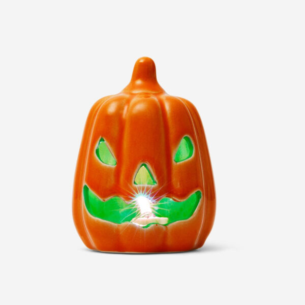 The festive and decorative luminous pumpkin creates a cosy atmosphere with a spooky twist. The ceramic LED lamp glows in several colours and uses 1 x CR2032 battery (included). The luminous pumpkin measures 10.6 x 7.8 x 7.8 cm.