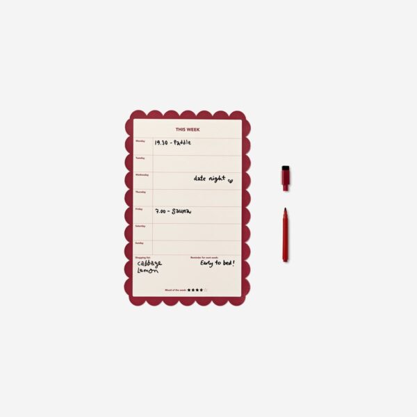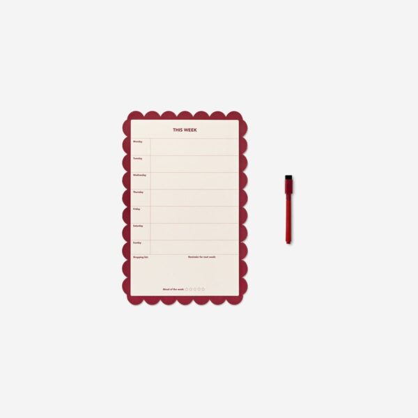 Bring charm and clarity to your weekly planning with this magnetic board featuring scalloped edges and a cheerful multi-coloured design. Made of acrylic resin and measuring 21 x 32 x 0,05 cm, it easily attaches to refrigerators or magnetic surfaces, making it ideal for kitchens or home offices. The planner board includes a marker for effortless updates, allowing you to organise tasks, meals or appointments in a simple, visual format. Its soft decorative border adds a touch of style while keeping your week clearly outlined and accessible. A functional planner, perfect for families, flatmates or anyone who prefers flexible, reusable planning with personality.