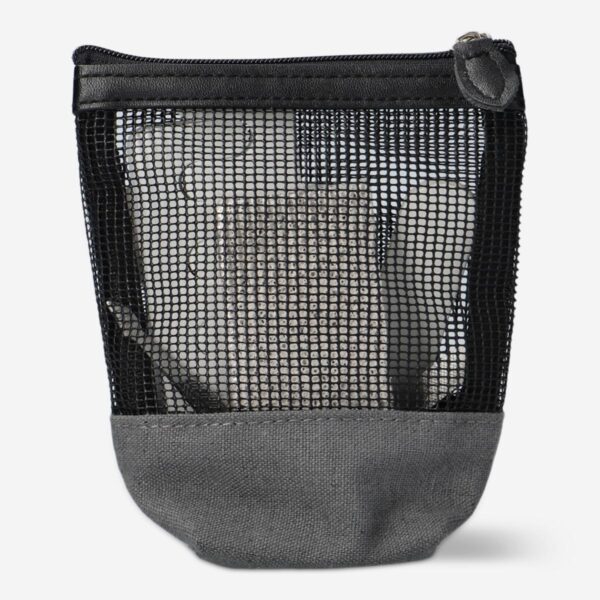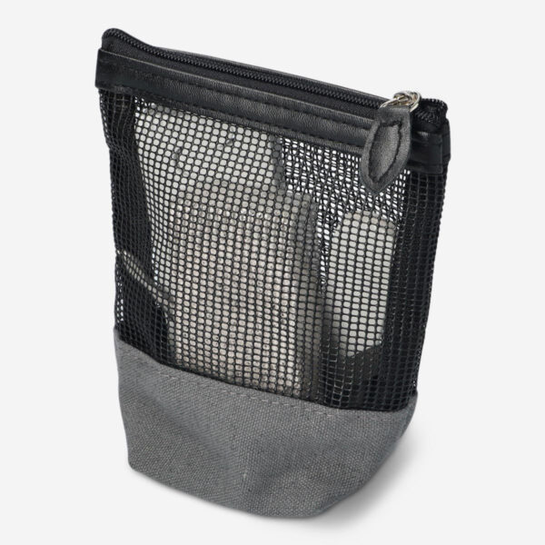 Nail care set for manicure and pedicure. Includes nail cutter, nail files, nail buffer, toe splicers, and a pumice stone. Comes in a zipper mesh bag. The bag fitting all tools measures 11.5 x 13.5 x 6 cm.