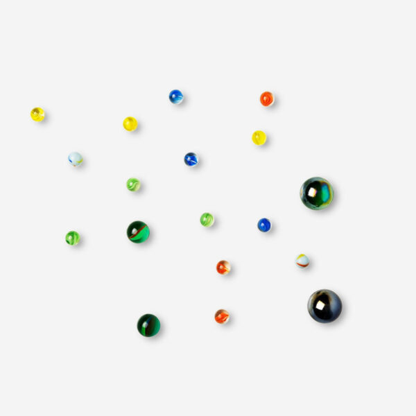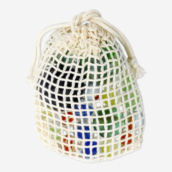 Dive into nostalgic play with this set of 18 marbles, the largest measuring 3.5 cm in diameter, nestled in a traditional cotton net. This multi-coloured assortment in three sizes promises endless fun for marble games or a charming addition to any collector’s trove. A simple yet enchanting pastime.