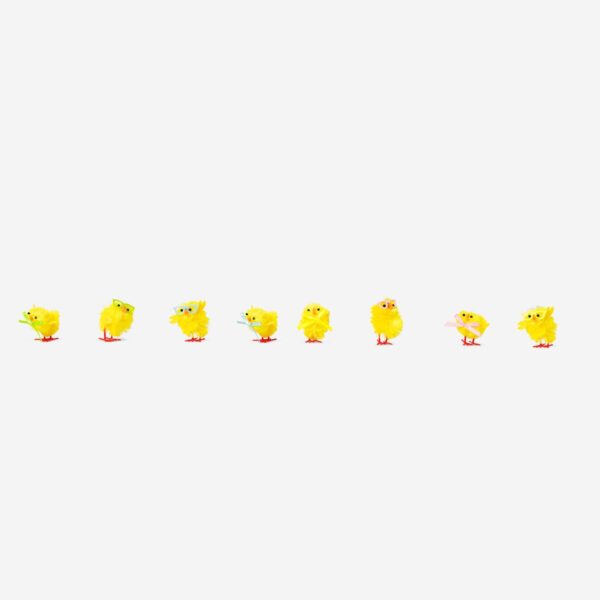 Add a fun and festive touch to your Easter celebrations with these adorable mini yellow Easter chicks. This set includes 8 tiny plastic chicks, each measuring 2.5 x 4 x 2.5 cm, in two different playful designs. Perfect for decorating your home, creating festive centrepieces, or adding a cheerful element to Easter baskets, these cute chicks bring a lively and joyful atmosphere to any holiday setup. Whether placed on a mantel, dining table, or as part of an Easter egg hunt, these decorative chicks are sure to delight family and friends. Celebrate the spirit of Easter with these charming mini decorations, perfect for adding a festive touch to your holiday décor.