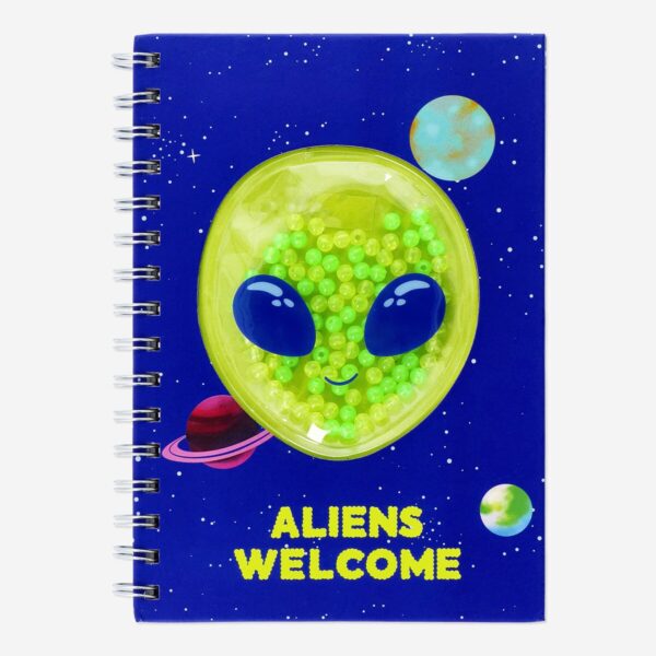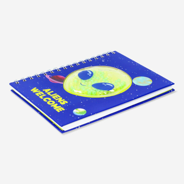 Capture your stellar ideas in this glow-in-the-dark alien notebook, spanning 14.8 x 21 x 2 cm. By day, scribble your thoughts, and by night, watch it illuminate with an otherworldly glow. This multi-coloured spiral-bound notebook is perfect for those who find inspiration in the cosmos and enjoy a bit of nocturnal novelty in their note-taking.