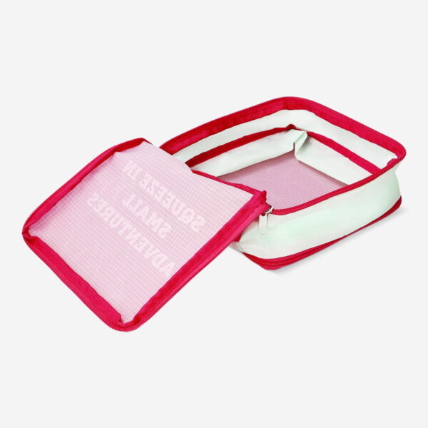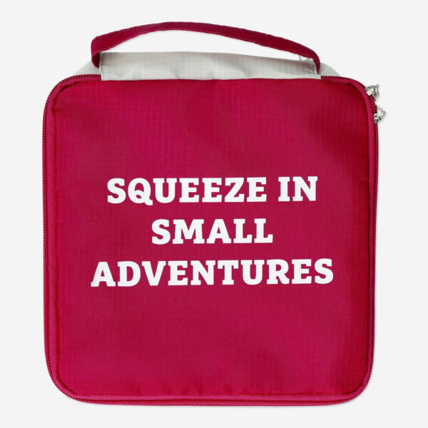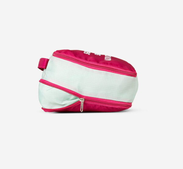 Embrace compact travel with this small square pink organiser bag, perfect for tucking away your trinkets. At 20 x 14 x 19.5 cm, it’s ideal for the little extras. The ingenious extra zipper allows for expansion, ensuring you can pack efficiently. A nifty accessory for keeping your small adventures organised.