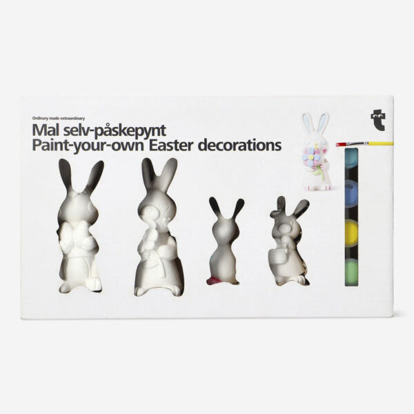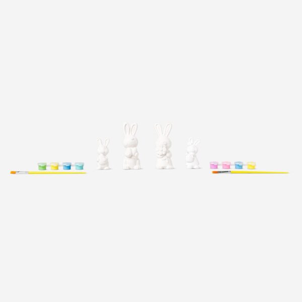 Embrace the Easter spirit with our paint-your-own bunny family set. This delightful hobby kit features white bunnies for you to decorate. The set, measuring 16.5 x 27.5 x 6.5 cm, includes 4 bunnies, 2 paintbrushes, 8 pots of paint and endless possibilities for creativity. Celebrate Easter by spending quality time with friends and family, painting your own charming Easter decorations. Unleash your artistic flair and add a personal touch to your holiday celebrations this Easter.