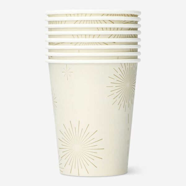 Celebrate in style with these festive paper cups featuring an elegant fireworks design. This set includes 8 decorative cups, each measuring 7.6 x 9 cm, perfect for serving your favourite beverages at your New Year event. The gold design adds a touch of sophistication to your tableware, making these cups ideal for festive occasions. Suitable for both hot and cold drinks, these cups can handle temperatures up to 70°C. Elevate your event with these stylish and practical cups, perfect for any New Year celebration.