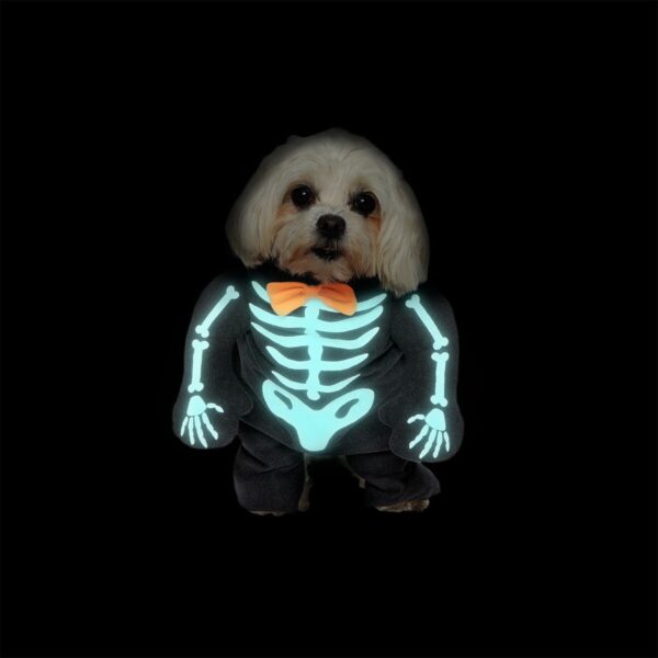 Give your furry friend a Halloween look to match the spooky season with this glow in the dark skeleton pet costume. Measuring 30 x 25 cm, this black costume features a printed skeleton design that glows in the dark, making it ideal for evening walks or festive parties. A bright orange bow adds a playful twist to the eerie look, while the soft material ensures comfort throughout wear. Easy to slip on and take off, this outfit is perfect for themed photos, trick-or-treat fun, or simply joining in on the autumn excitement. Whether lounging at home or out on parade, your pet will be the centre of attention in this charming Halloween costume.