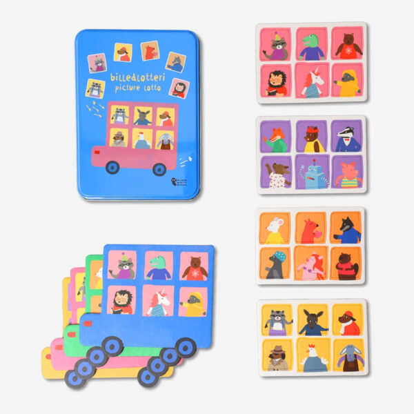 Enjoy a classic game of picture lotto with this delightful set, perfect for family fun and educational play. Housed in a metal tin, this picture lotto game is designed to be both engaging and easy to store. The vibrant blue tin contains four playing boards, each with corresponding pieces, providing everything you need for an enjoyable game session.
