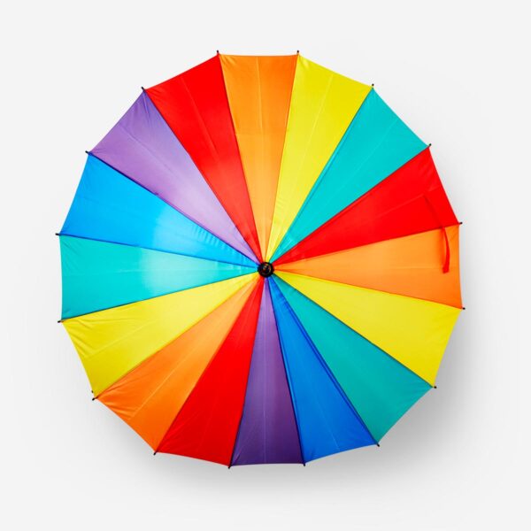 Add a splash of colour to grey skies with this umbrella featuring a vibrant rainbow pattern. Measuring 80 cm in length and 110 cm in diameter, it provides ample coverage while walking. The multicoloured panels bring a fun and playful touch to your rainy-day essentials, making it a practical and cheerful accessory to keep close at hand.