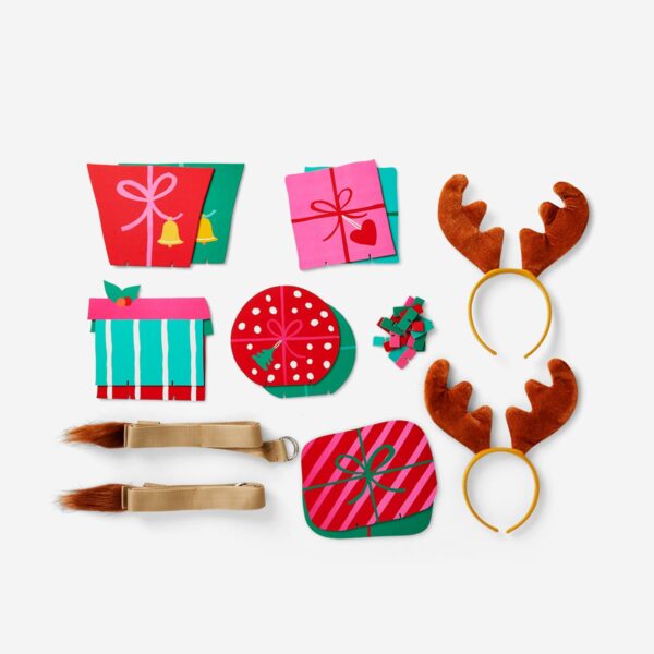 Attached the small cardboard pieces to the presents and place them on the floor in two rows. Each player attaches a tail to their waist and puts on the antlers.