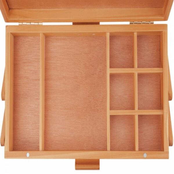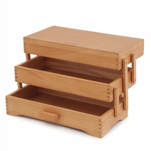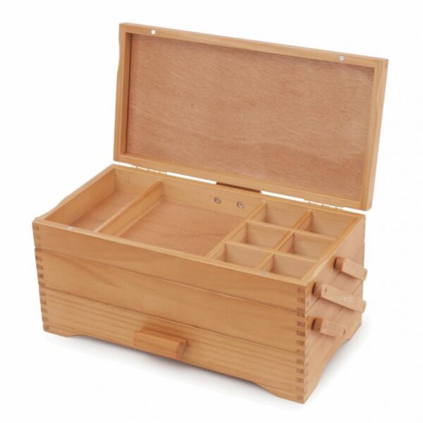 Made from pine wood. Special legs to support and stabilise the box when fully open. Magnetic fastening closure on lid. Top drawer has divisions for storing smaller items such as bobbins, needles etc. Wooden handles to facilitate opening. Laser etched with Milward logo. Item size: (d/w/h) 17 x 37 x 22.6cm.