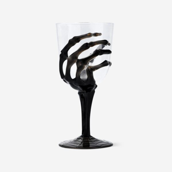 Add a spooky twist to your drinks this Halloween with this skeleton hand cup, perfect for themed gatherings. Made of plastic and finished in black, it features a sculpted skeletal hand gripping the bowl of the glass for a playful and eerie touch. Measuring 8.5 x 17.6 x 8 cm and holding up to 350 ml, it is suitable for food and ideal for serving everything from juice to party punch. Lightweight and easy to clean, this cup is great for both table settings and drink stations. Whether used for serving or as part of your Halloween display, it adds instant festive flair.