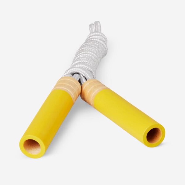 Skipping rope with wooden handle. Measures 200 cm. Available in more designs.