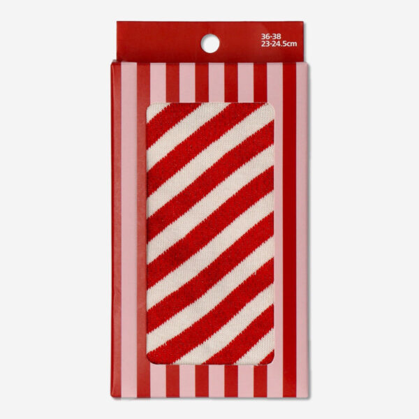 Embrace holiday cheer with our socks candy canes with glitter! These red socks, size 36-38, are made of 56% polyester (53% recycled), 35% cotton, 6% metallised fibre, and 3% elastane. The delightful candy cane design is enhanced with glitter for festive flair.