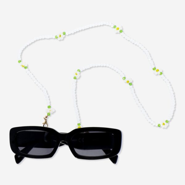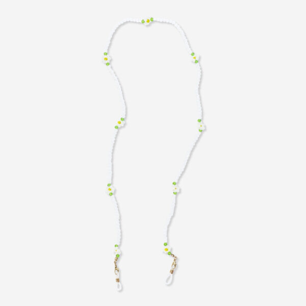 This charming spectacle strap adorned with beadwork and delicate flower accents offers a stylish way to keep your glasses within reach. Measuring 73 cm in length, it’s made from glass, metal, and natural rubber, ensuring durability and comfort. A lovely and practical accessory for any glasses wearer.