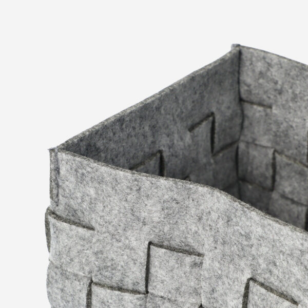 Declutter your space with our grey braided recycled felt storage basket. Measuring 15 x 15 x 12 cm, this basket is made from 100% recycled polyester and can hold a maximum weight of 1 kg. Its braided design adds a touch of texture and style to your home organization.
