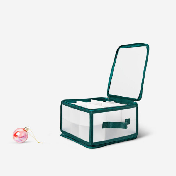 Store your beautiful Christmas baubles in the storage box with room for 18 baubles. The storage box is made with polyester textiles and paper cardboard. 24% of the materials used for the storage box are recycled. The maximum weight recommended is 5 kg. The storage box measures 23.5 x 23.5 x 16 cm.