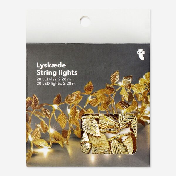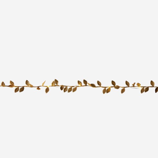 Illuminate your space with elegance using these string lights with golden leaves. Measuring 228 x 7.6 x 3.2 cm, this LED string features 20 decorative bulbs nestled among beautiful golden leaves, adding a touch of sophistication to any setting.