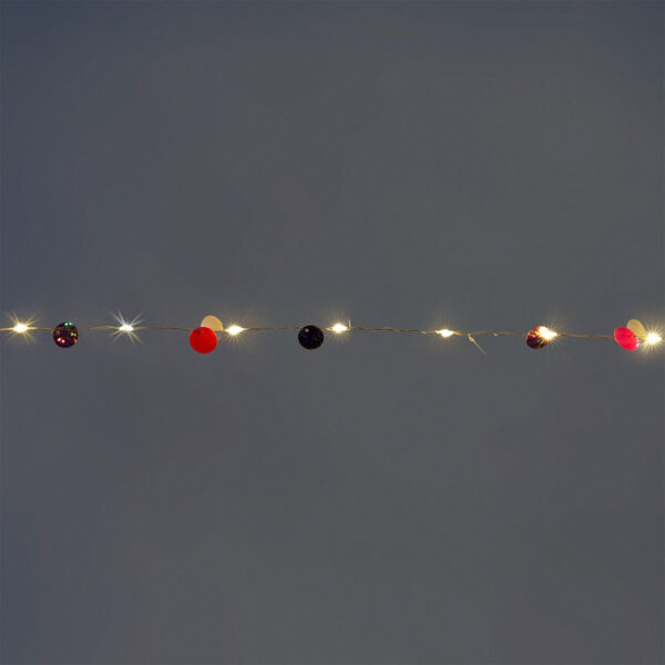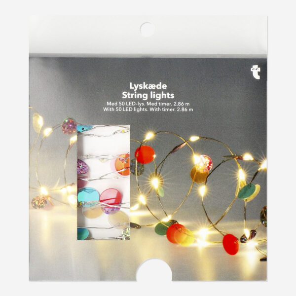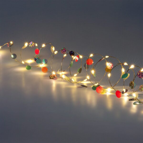 Illuminate your home with these enchanting string lights with sequins. Featuring 50 LED lights, this multi-coloured light chain measures 286 cm in length and is made of metal adorned with plastic sequins. The sparkling sequins add a festive touch, making these lights perfect for holiday decor, parties, or adding a whimsical glow to any room. Equipped with a convenient timer, you can easily set the lights to turn on and off automatically. Ideal for creating a magical atmosphere, these string lights with sequins are a versatile and delightful addition to your home decor. Please note they require 2xAA batteries, which are not included.