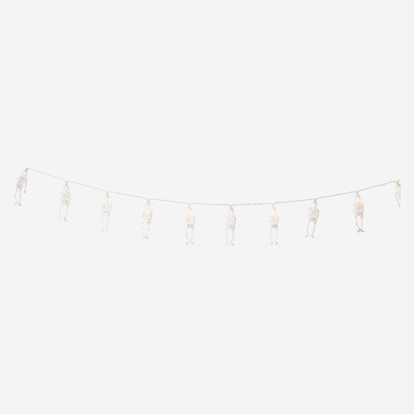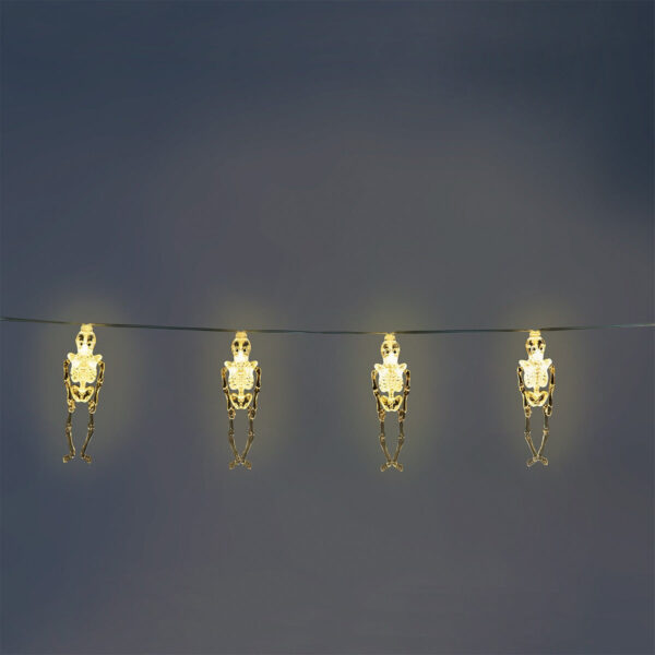 Illuminate your Halloween celebrations with these spooky string lights featuring skeleton designs. Measuring 285 cm in length, these festive lights include 10 LED skeleton bulbs that add a hauntingly fun touch to your home decor. Perfect for indoor use, these Halloween string lights are ideal for creating a spine-chilling atmosphere for your party or seasonal display. Please note that the light chain requires 2 x AA batteries, which are not included. Add a creepy glow to your festivities with these unique skeleton-themed string lights.
