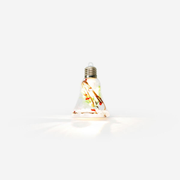 Decorative terrarium light as a light bulb with festive snow and branches. Uses 3 x LR44 batteries (included). Measures 11.5 x 7.8 cm.