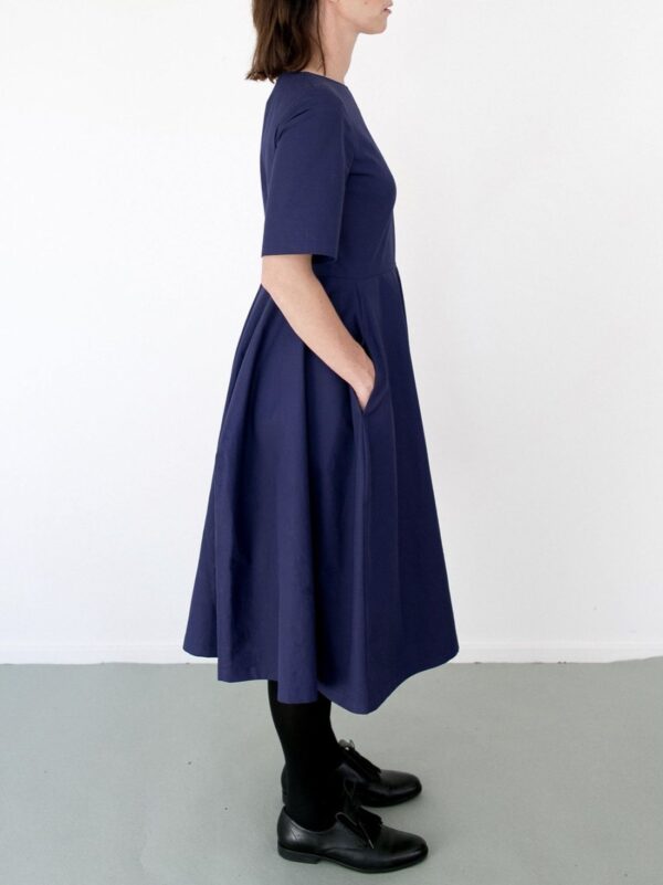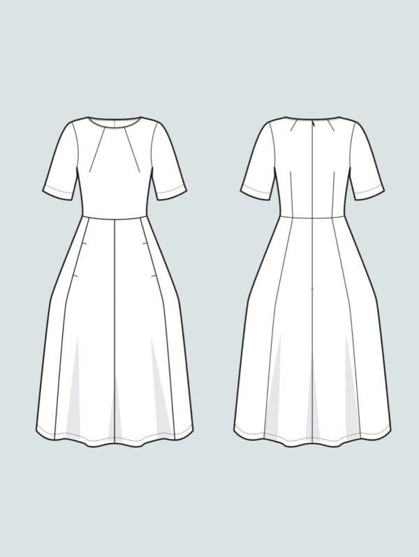 The Tulip dress is our most classic design with a closely fitted top and a wide tulip shaped skirt. Features zipper opening at back and in-seam pockets.