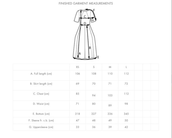 - Fabric Requirements: 140-150 cm fabric width XS 2.7 m / S 2.8 m / M 2.9 m / L 3.0 m