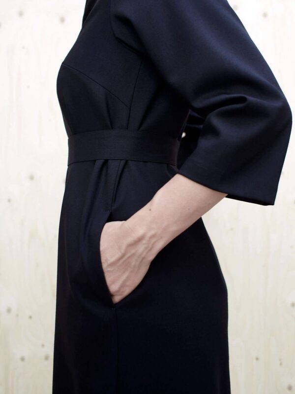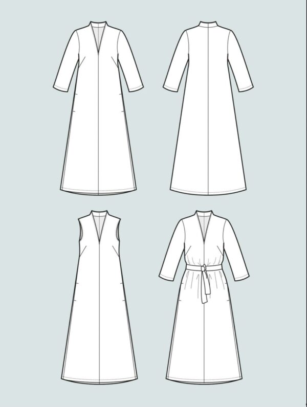 The V-neck dress sewing pattern has an elegant narrow V-shaped neckline that continues as a collar in the back of the neck. It features 3/4 length sleeves, pockets in side seams, and an optional belt. The pattern includes parts and instructions to make the model with or without sleeves.