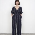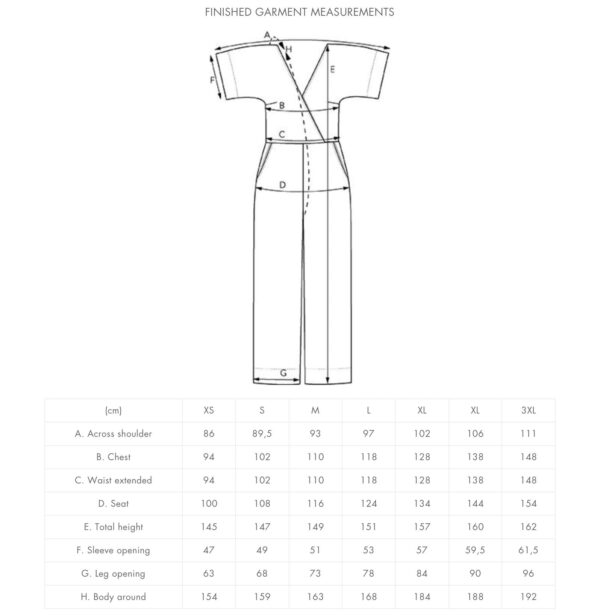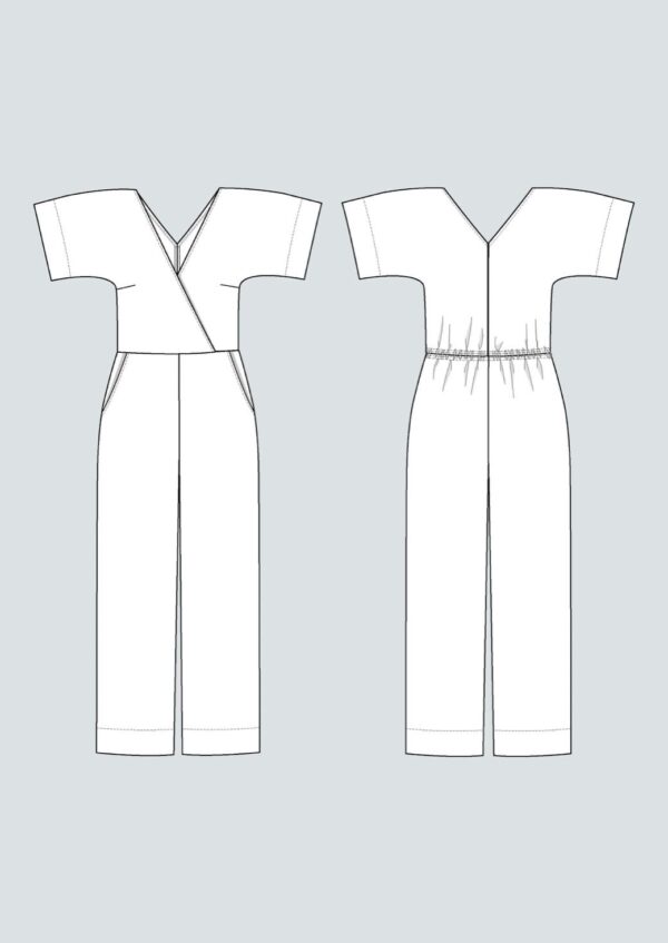 This easy to make wide-leg jumpsuit features a dropped shoulder with a front and back v-neck. It has pockets, a voluminous leg and an elasticated waist in the back. If you wish you can add a belt and belt loops. Like a kaftan dress, but with legs!