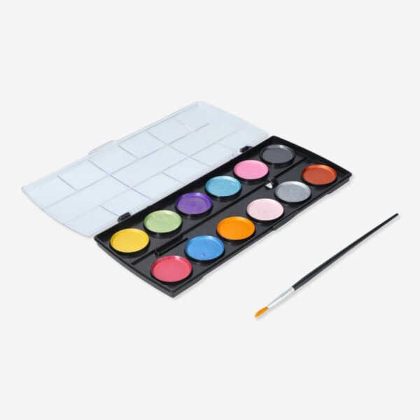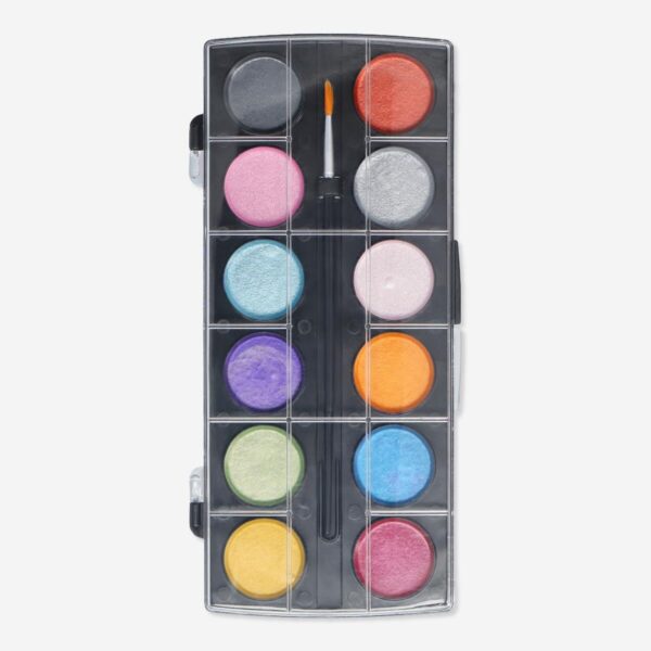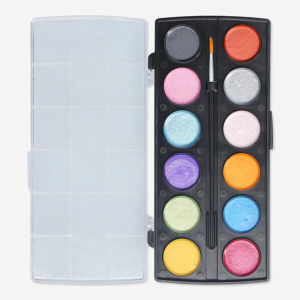 Watercolour paint set with 12 metallic colours. The set includes a brush. The watercolour paint set measures 21.3 x 19 x 1.5 cm.