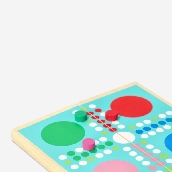 The colourful game board and pieces add a vibrant touch to the classic game of Ludo, appealing to both children and adults. This set includes everything you need to play, including the game board, dice, and playing pieces, all neatly stored in the wooden box.